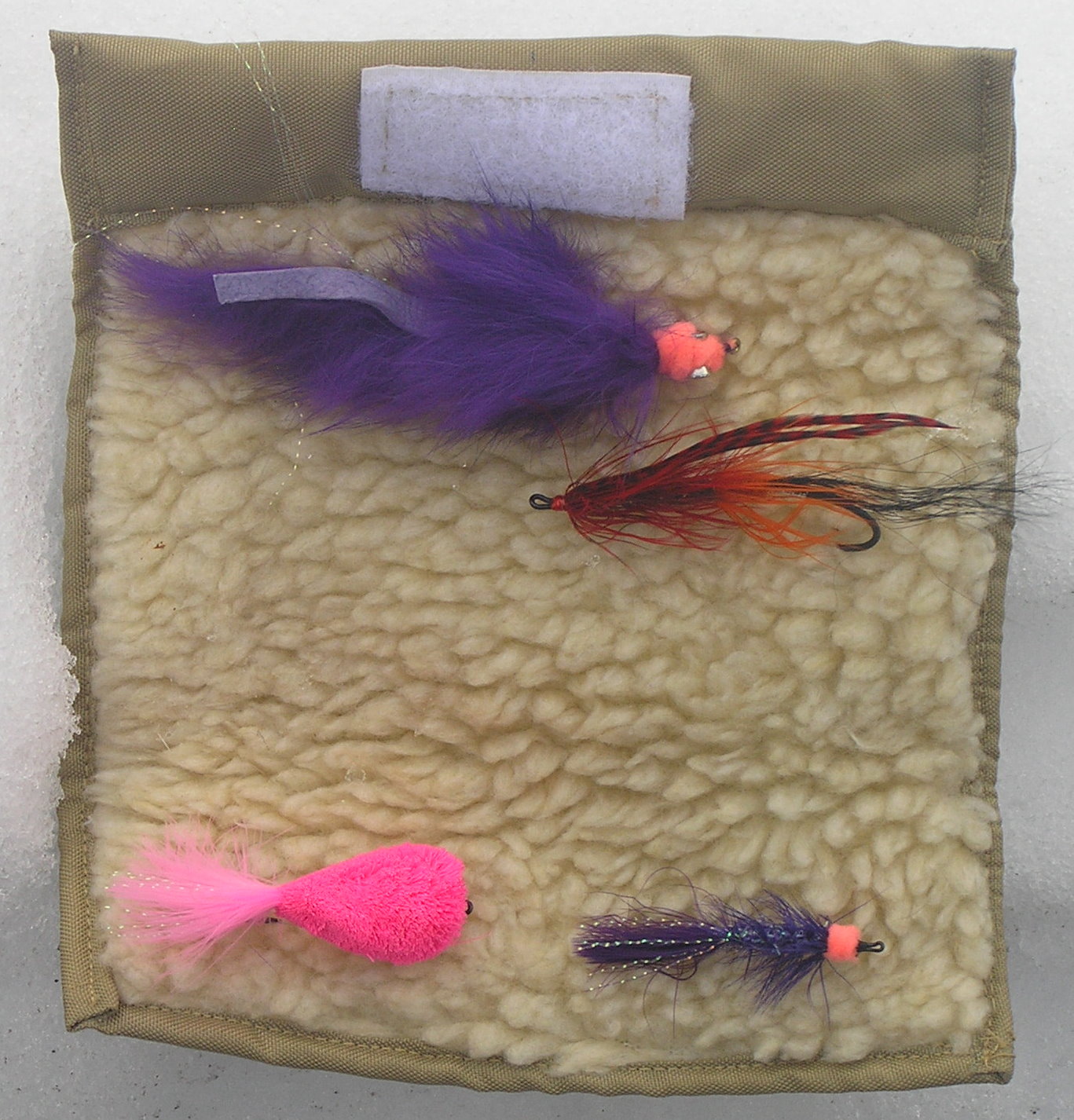 FLY WALLET The Fly Wallet is great alternative to the hard fly box. The wallet will fit into any shirt pocket providing you with a soft safe place to store your flies and streamers. I have even stored the wallet under my hat when fishing in deep water. The outside of the shearing lined wallet is covered with nylon. A Velcro strip provides a positive closure. The wallet measures 5.5" x 6.0" inches. #1575 Price $16.50 each |
