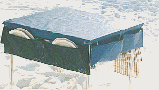 Table! Problem: There just isn't enough room on the Roll-A-Table® while cooking. Everytime, you turn around, someone is setting something else on the table you are trying to cook on. Answer: The Great Escape Works Table Cover and DishRack. Roll-A-Table Cover and Rack This cover increase your table space by 90% using pockets. You have drying racks that holds eight full size dinner plates, eight cups and all your silverware. In addition to all the places to dry out dishware, there is a paper towel dispenser and a rack for drying wet towels. The cover is easy to clean flat surface. The table is more wind resistant due to the weight of all the dishware. The Great Escape Works Table and Dish Rack attaches to the standard 32" x 32" Roll-A-Table® in seconds using four elastic straps on the corner of the table. Table cover material is made of PVC Fabric. Patent Pending. Color: Blue and Black Made in United States of America #2001 $ 81.50 |